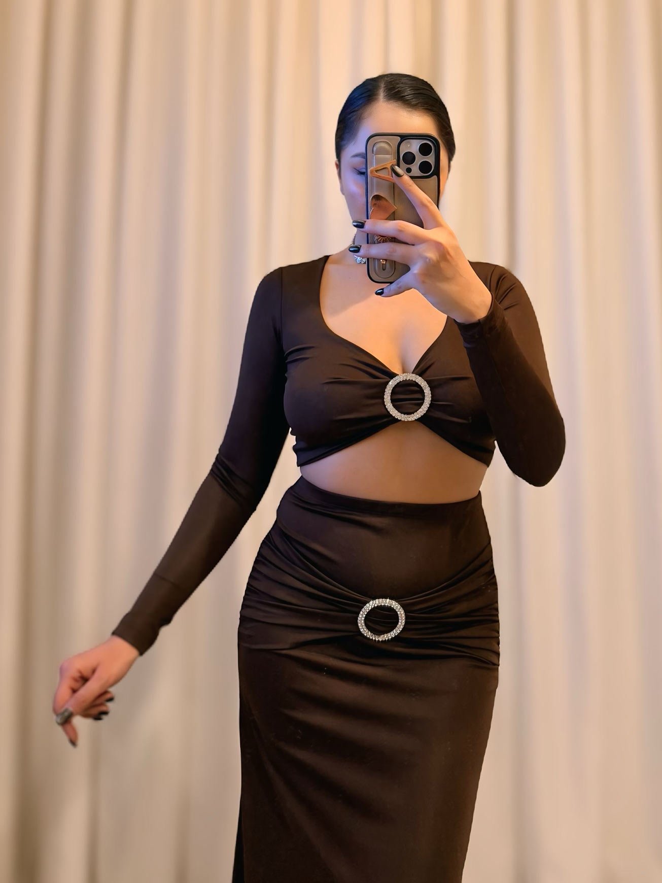 Modern şıklığı ve iddialı bir görünümü bir arada sunan bu aks detaylı ikili takım, hem üst hem de etek kısmında bulunan taşlı halka aksesuarlarıyla dikkat çekici bir siluet oluşturuyor.