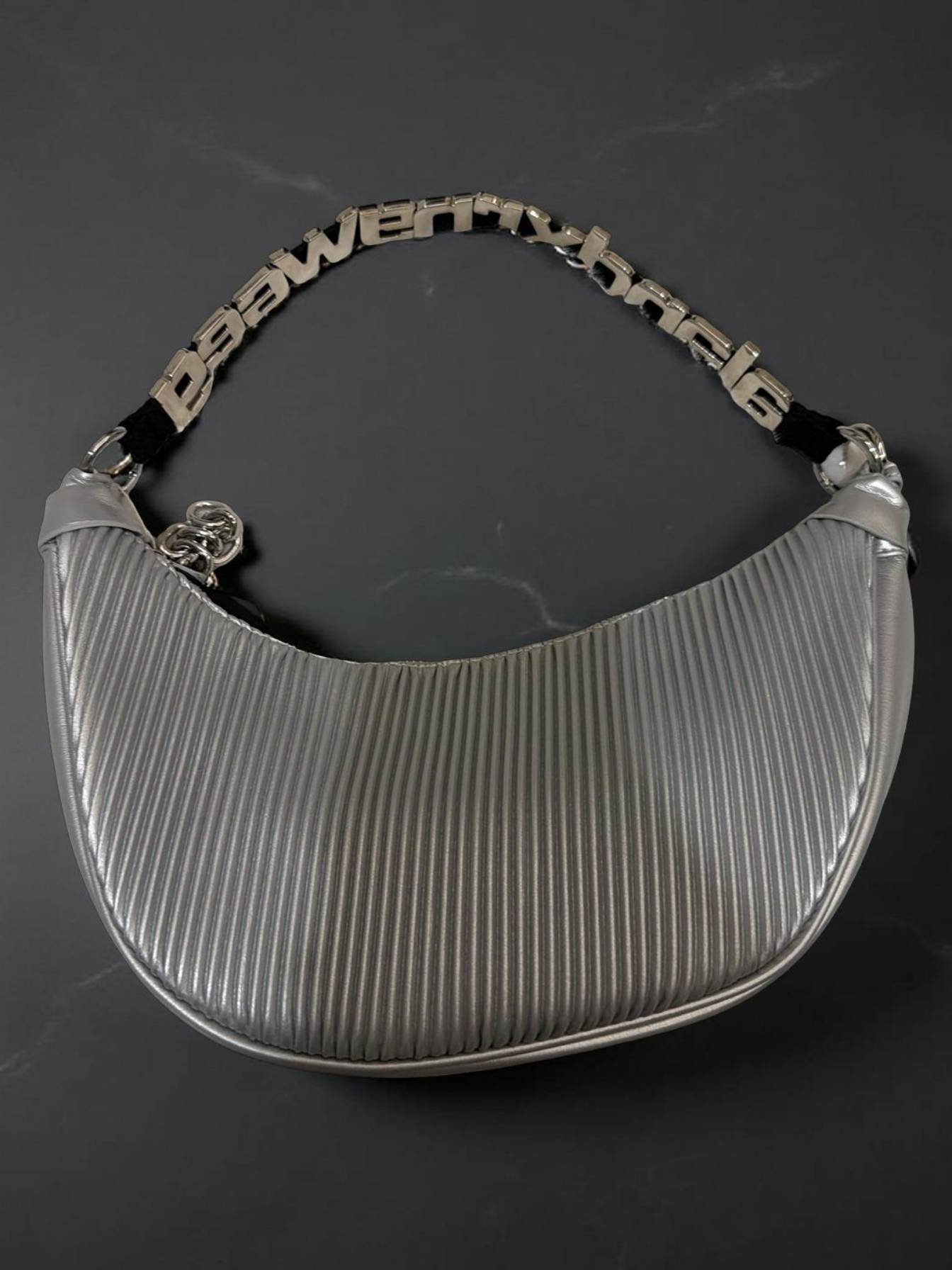 Modern ve çarpıcı tasarımıyla öne çıkan bu gümüş omuz çantası, metalik dokusu ve zarif pile detaylarıyla stilinize güçlü bir ışıltı katar. Özel tasarım metal zincir askısı çantaya sofistike ve iddialı bir hava kazandırırken, kompakt formu hem günlük hem de gece kombinleri için ideal kullanım sunar.