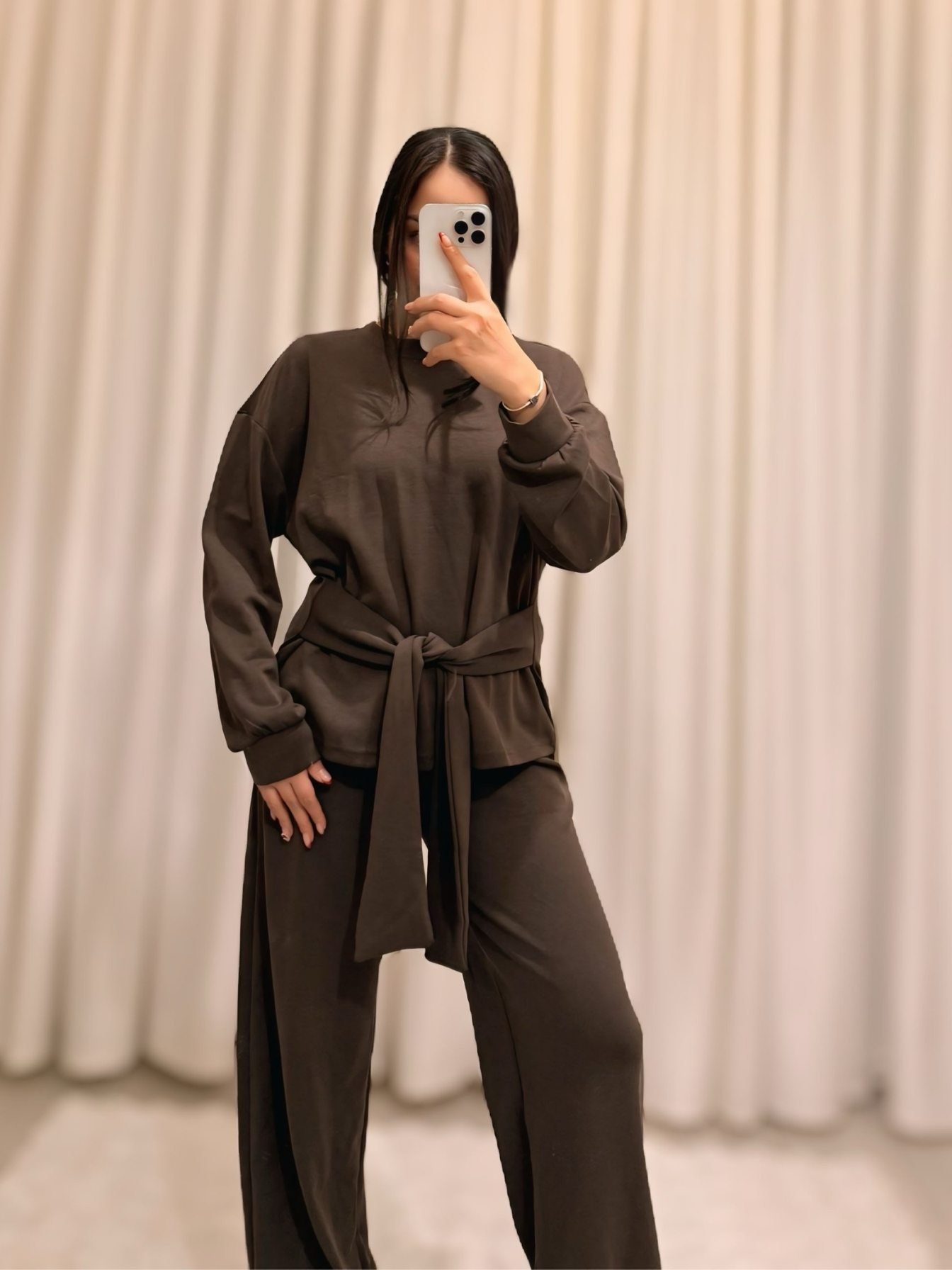 Belden bağlama detaylı üst parçası ve rahat kesimiyle öne çıkan bu kahverengi takım, günlük ve şık kombinler için ideal bir tercihtir.