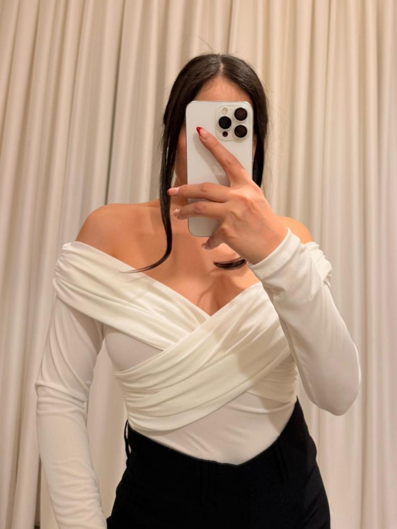 Omuz dekoltesi ve çapraz drape detaylarıyla dikkat çeken bu beyaz bluz, zarif ve feminen kombinler için ideal bir tercihtir.