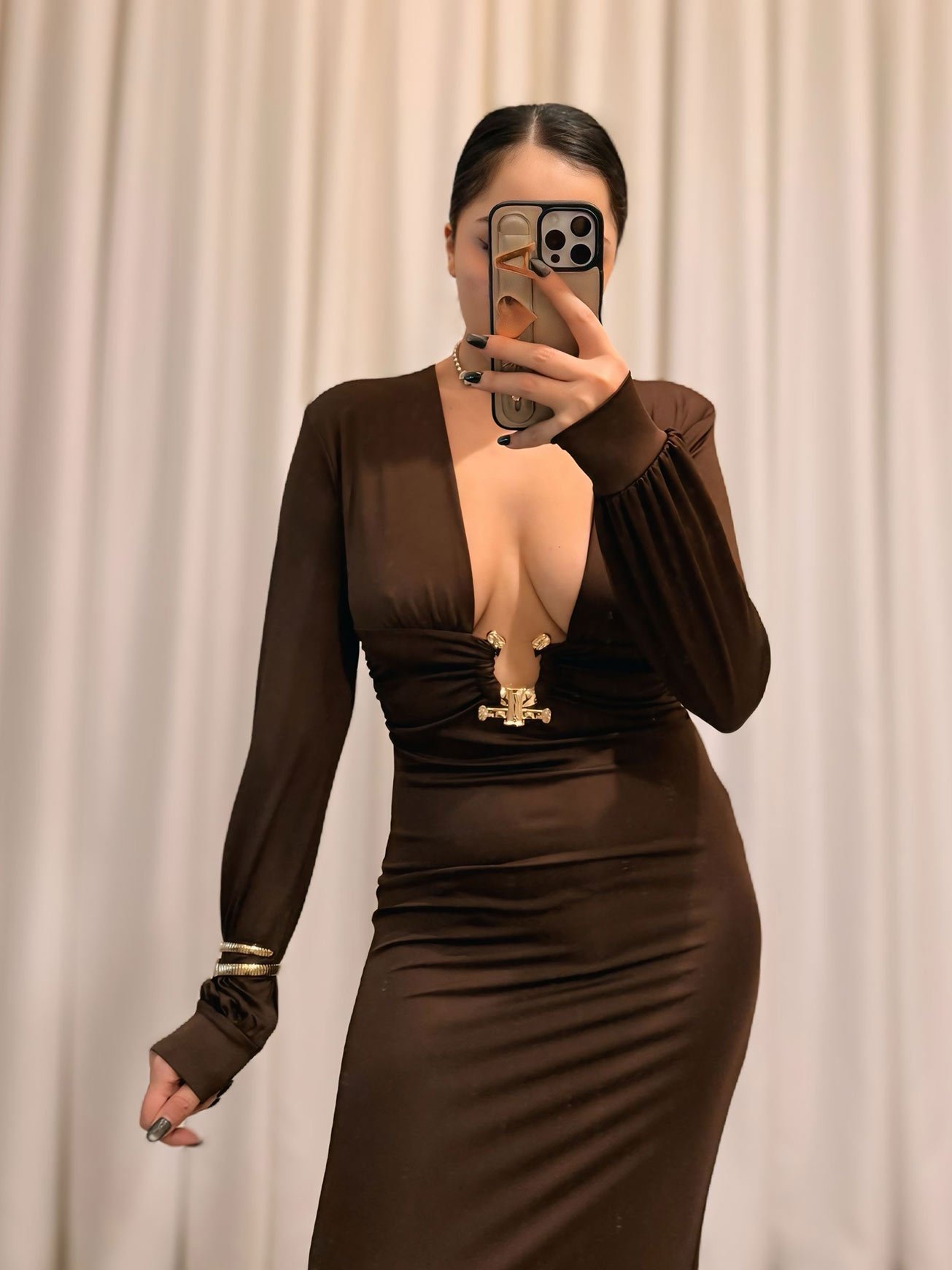 Şıklığın en güçlü hâlini yansıtan bu maxi boy dalgıç kumaş elbise, derin göğüs dekoltesini tamamlayan altın tonlu aksesuarı ile hem modern hem de göz alıcı bir duruş sergiliyor.