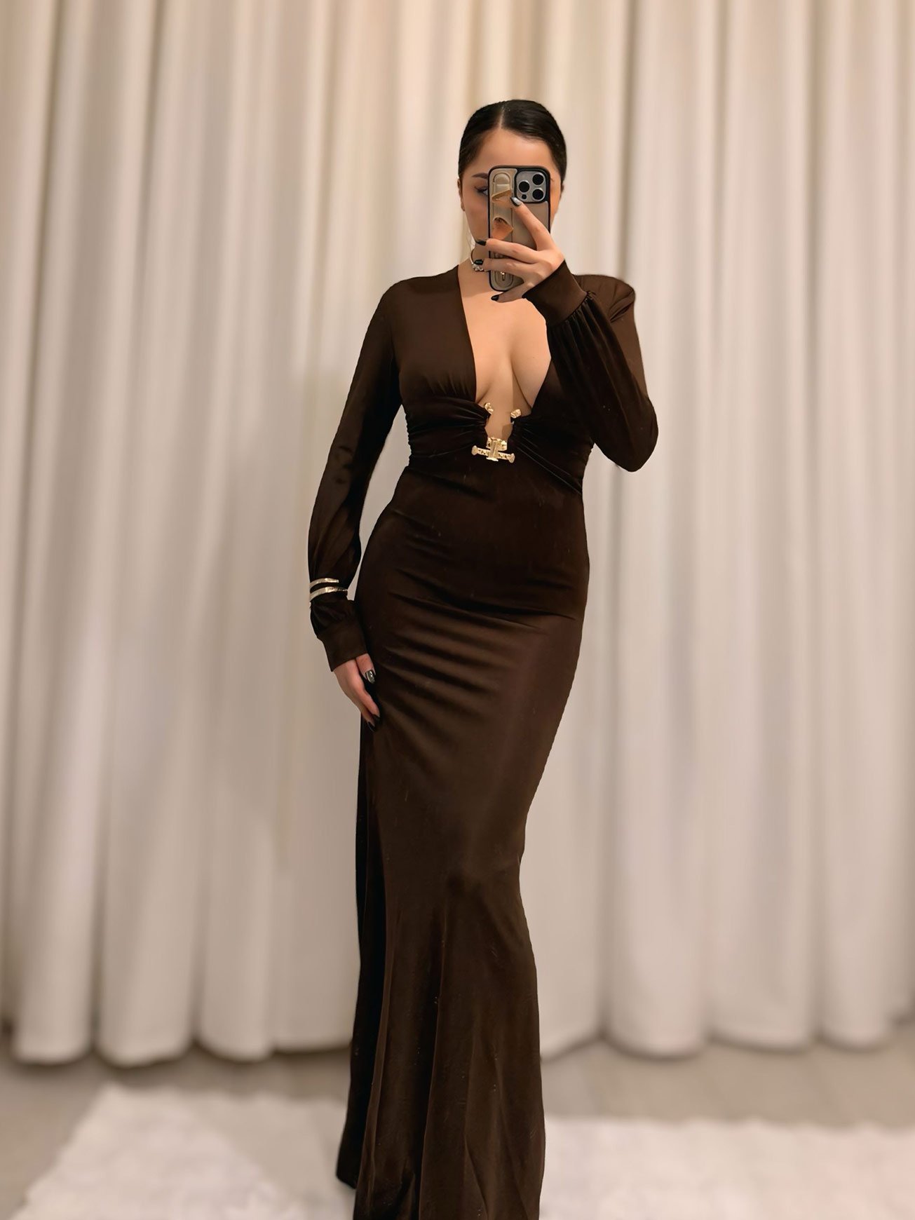 Göğüs Aksesuar Detaylı Kahve Maxi Elbise – Dalgıç Kumaş