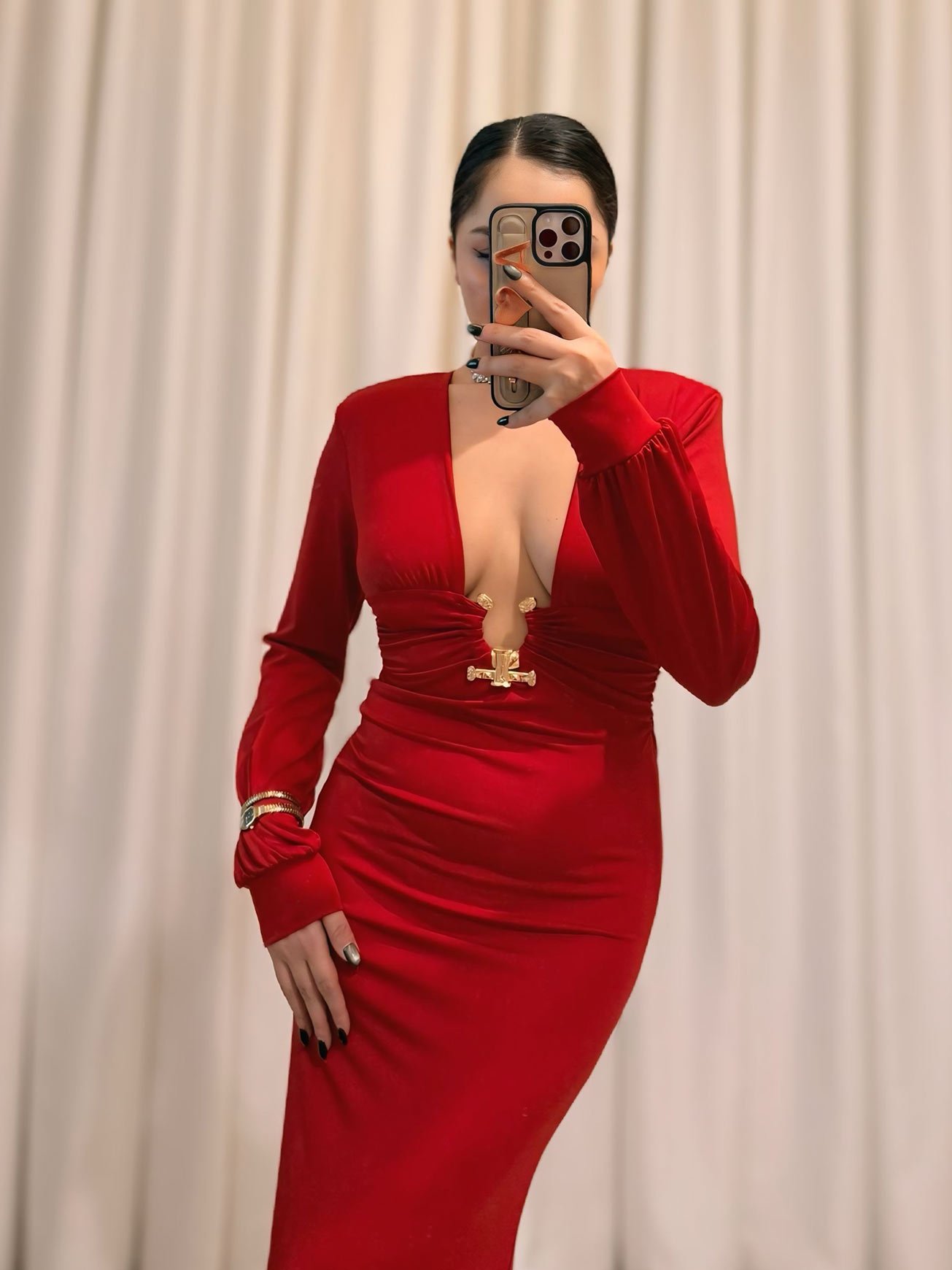 Şıklığın en güçlü hâlini yansıtan bu maxi boy dalgıç kumaş elbise, derin göğüs dekoltesini tamamlayan altın tonlu aksesuarı ile hem modern hem de göz alıcı bir duruş sergiliyor.