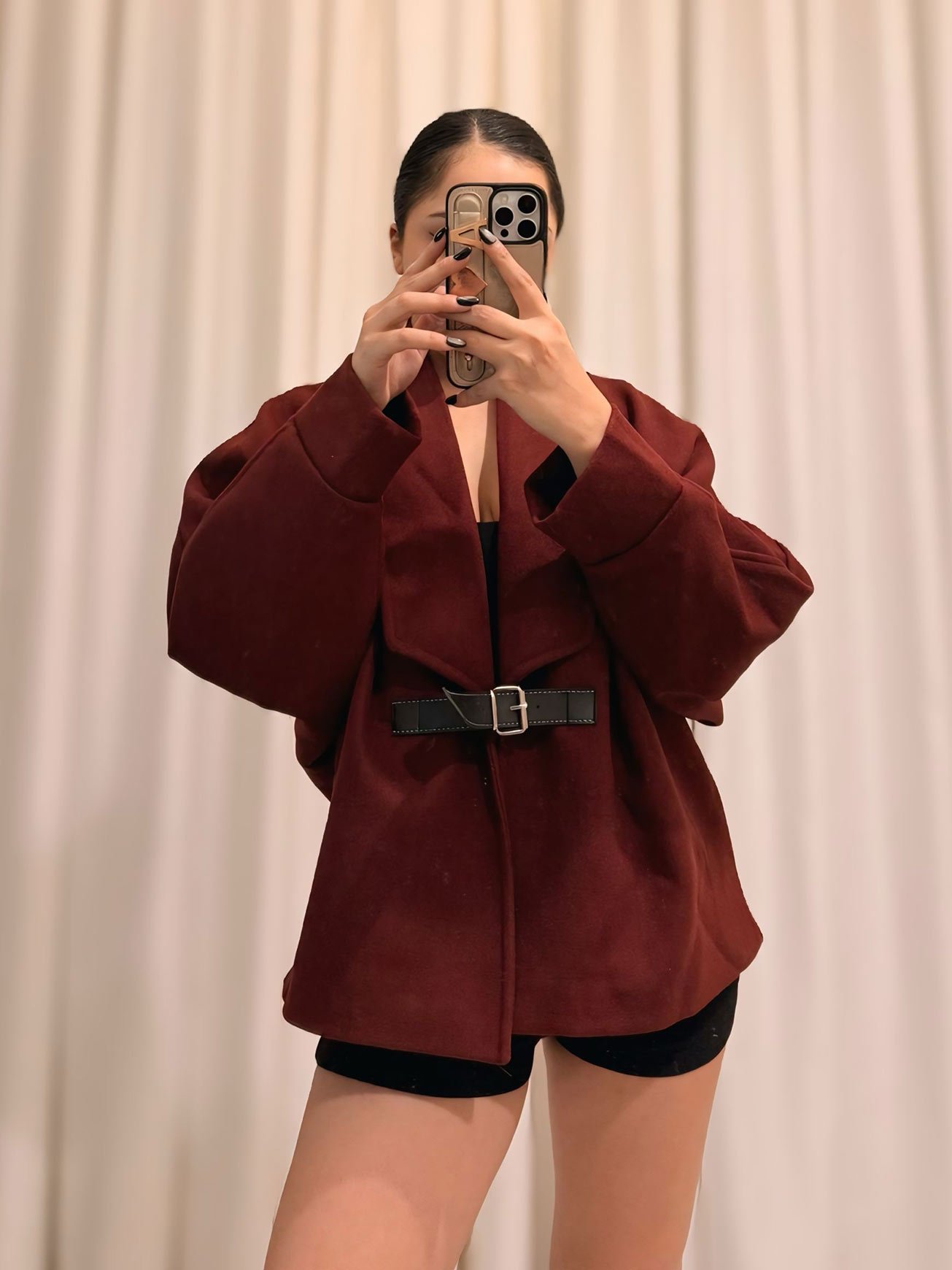 Kaşe Kumaş Deri Kemerli Bordo Tasarım Ceket