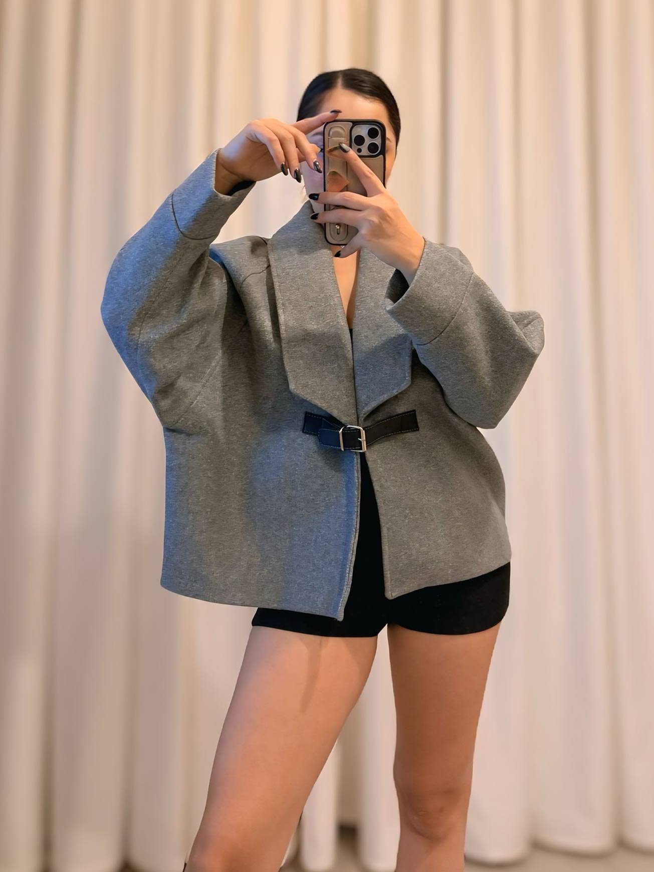 Kaşe Kumaş Deri Kemerli Gri Tasarım Ceket