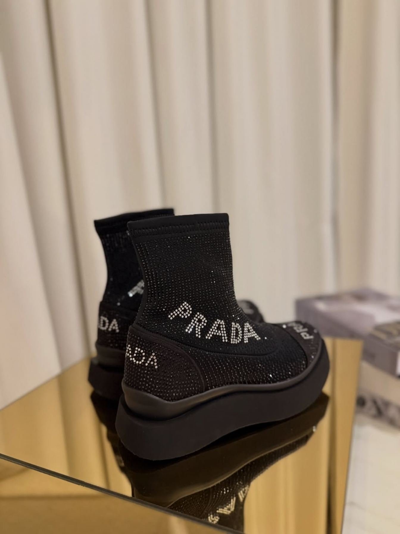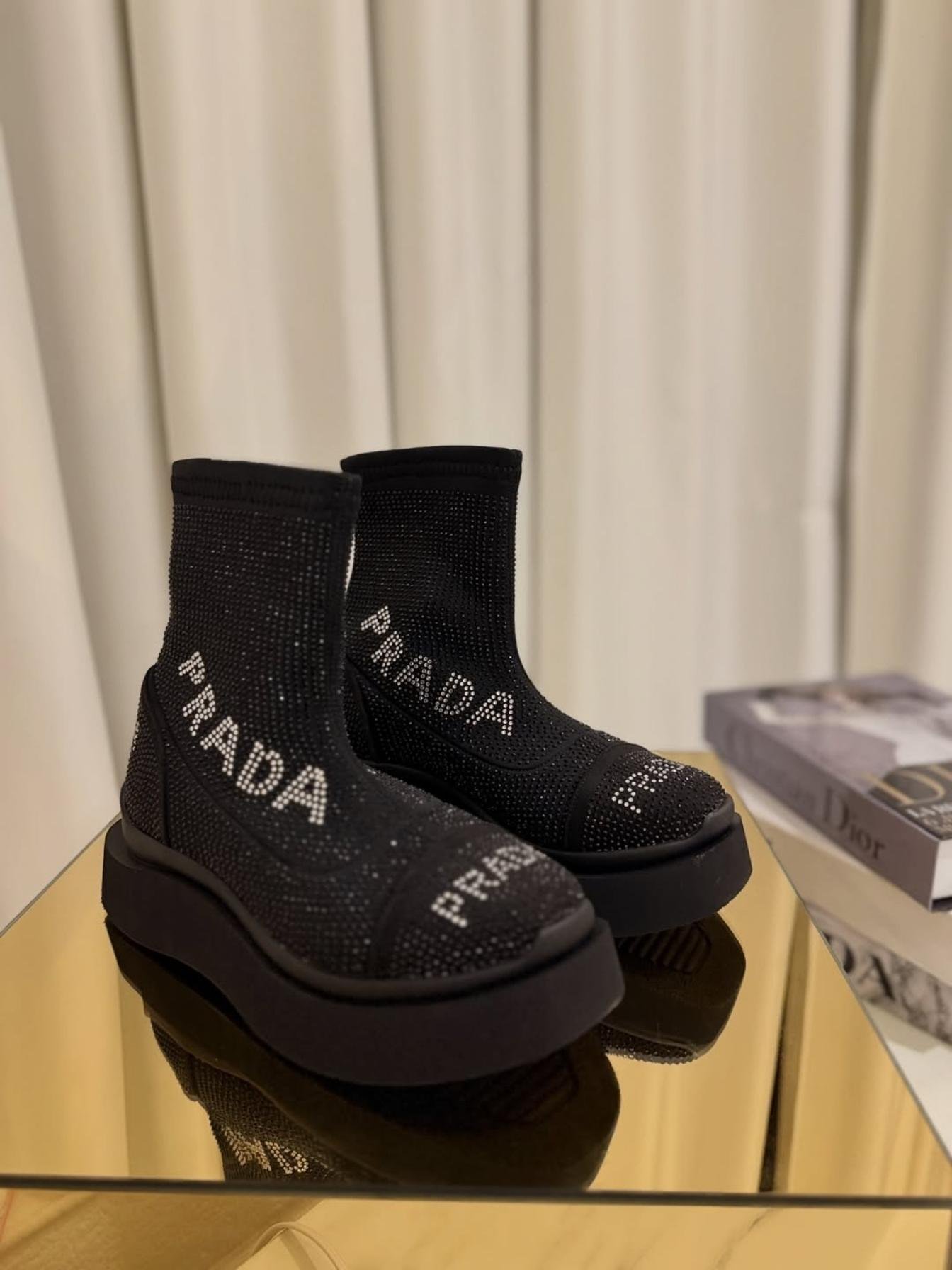 Taş işlemeli yazı detayları ve kalın platform tabanıyla öne çıkan bu siyah çorap bot, modern ve konforlu bir stil arayanlar için ideal bir seçimdir.