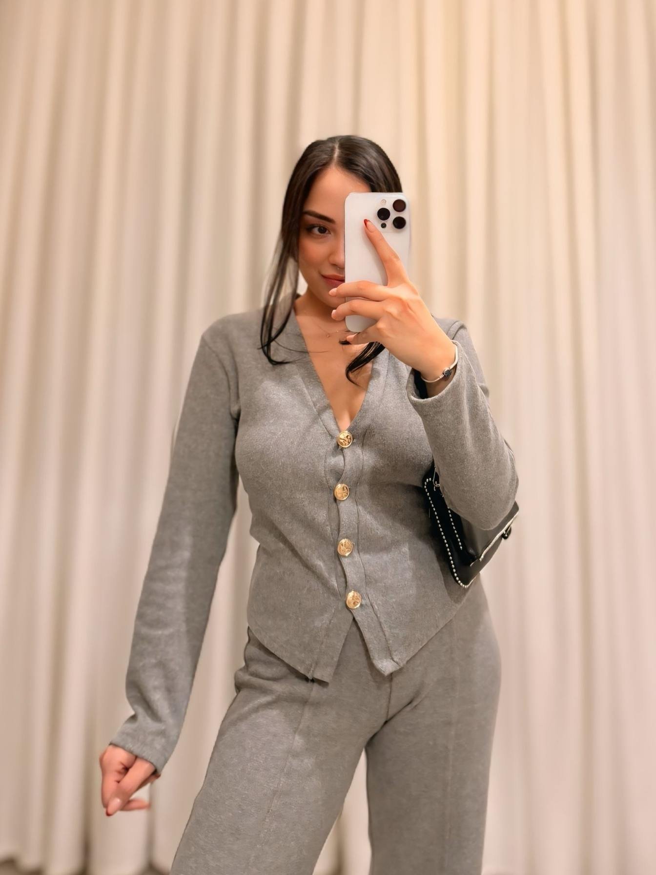 Zamansız şıklığı ve konforu bir arada sunan bu füme triko takım, zarif düğme detaylarıyla feminen bir stil oluşturur. V yaka ve düğmeli üst parça vücuda uyumlu kesimiyle şık bir siluet sunarken, yüksek bel ve düz paça pantolon gün boyu rahat bir kullanım sağlar. Yumuşak ve esnek triko kumaşı sayesinde hem günlük kombinlerde hem de şık davetlerde rahatlıkla tercih edilebilir. Minimal ve modern tasarımı sayesinde sneaker, bot ya da topuklu ayakkabılarla kolayca kombinlenerek farklı stillere uyum sağlar.