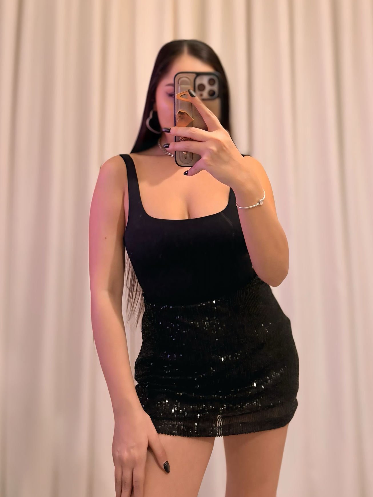 Şıklığı ve zarafeti bir arada sunan bu siyah payet mini etek, ışıltılı görünümü ve esnek yapısıyla özel gün kombinlerinizi kusursuz bir şekilde tamamlar. Parlak siyah payetleri ışıkla birlikte parlayarak dikkat çekici ama zarif bir ışıltı oluşturur.