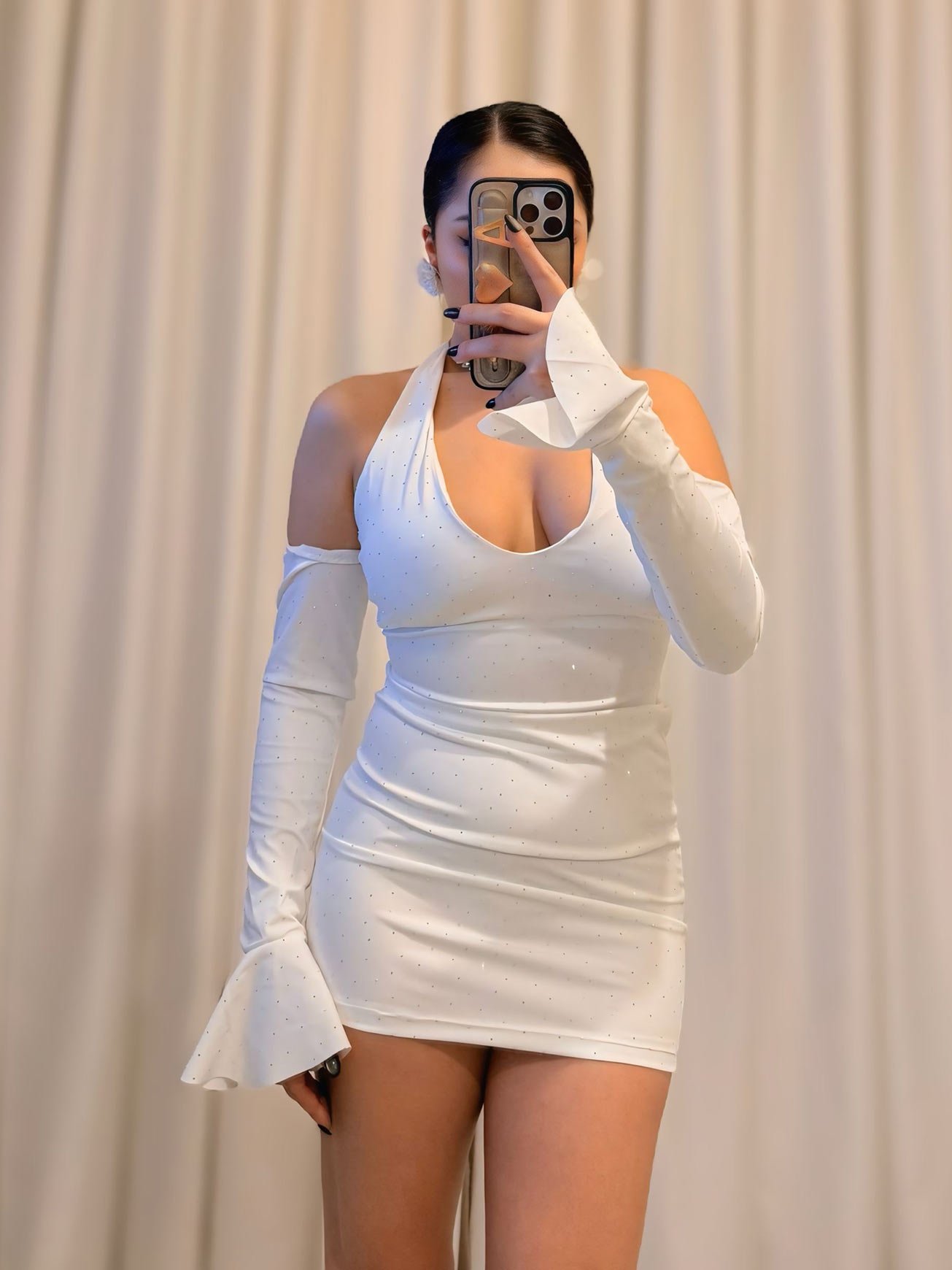 Elegan ve modern bir görünüm isteyenlerin favorisi olacak bu tam taş işlemeli beyaz halter mini elbise, zarif duruşu ve ışıltılı detaylarıyla tüm gözleri üzerinize toplar.