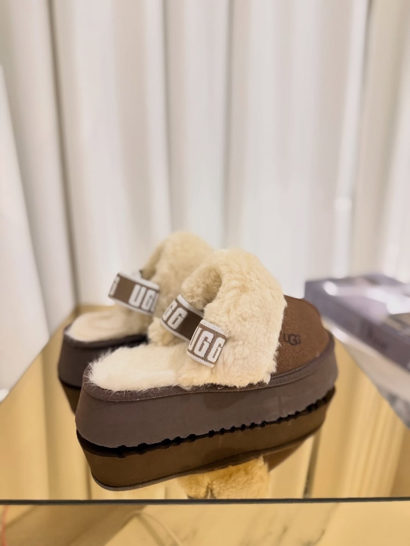 Pelüş astarı, kalın platform tabanı ve logo detaylı bant tasarımıyla öne çıkan bu kahve terlik, konforlu ve modern bir stil sunar.